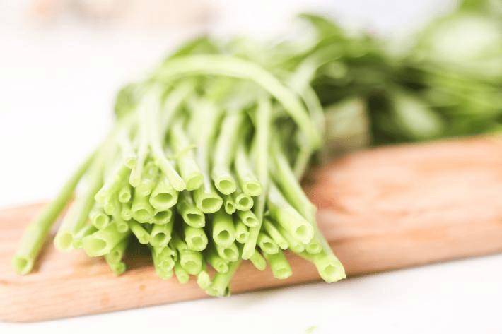 (2)热锅下油,放入蒜瓣炒香,再放入空菜梗迅速翻炒断生。