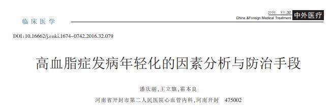 [1]潘庆丽,高血脂症发病年轻化的因素分析与防治手段,中外医疗,2016-11-11