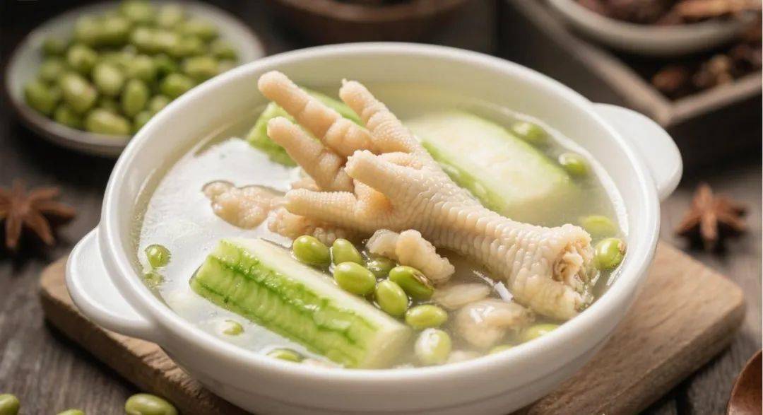 做法:眉豆洗净,加清水浸泡30分钟;节瓜去皮,洗净,切小块,备用;鸡脚洗干净,切为小段,开水烫去血水,捞出备用。烧开水后,放入全部材料,大火煮至沸腾后转文小火熬1小时,加盐调味即可。