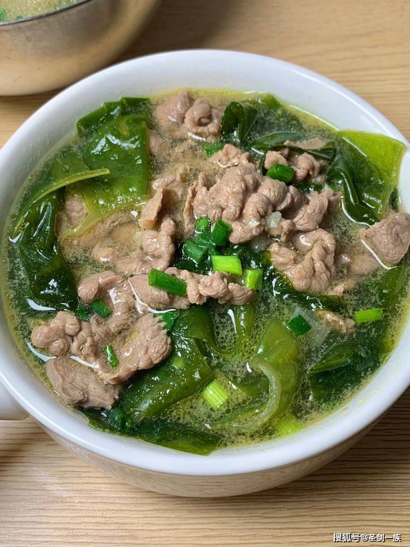 准备食材: 牛肉、裙带菜、姜丝、蒜末。
