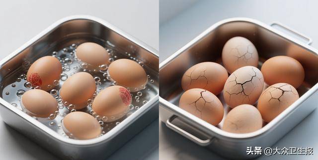 用勺子轻轻把鸡蛋敲开一点裂缝,再煮10分钟,关火。