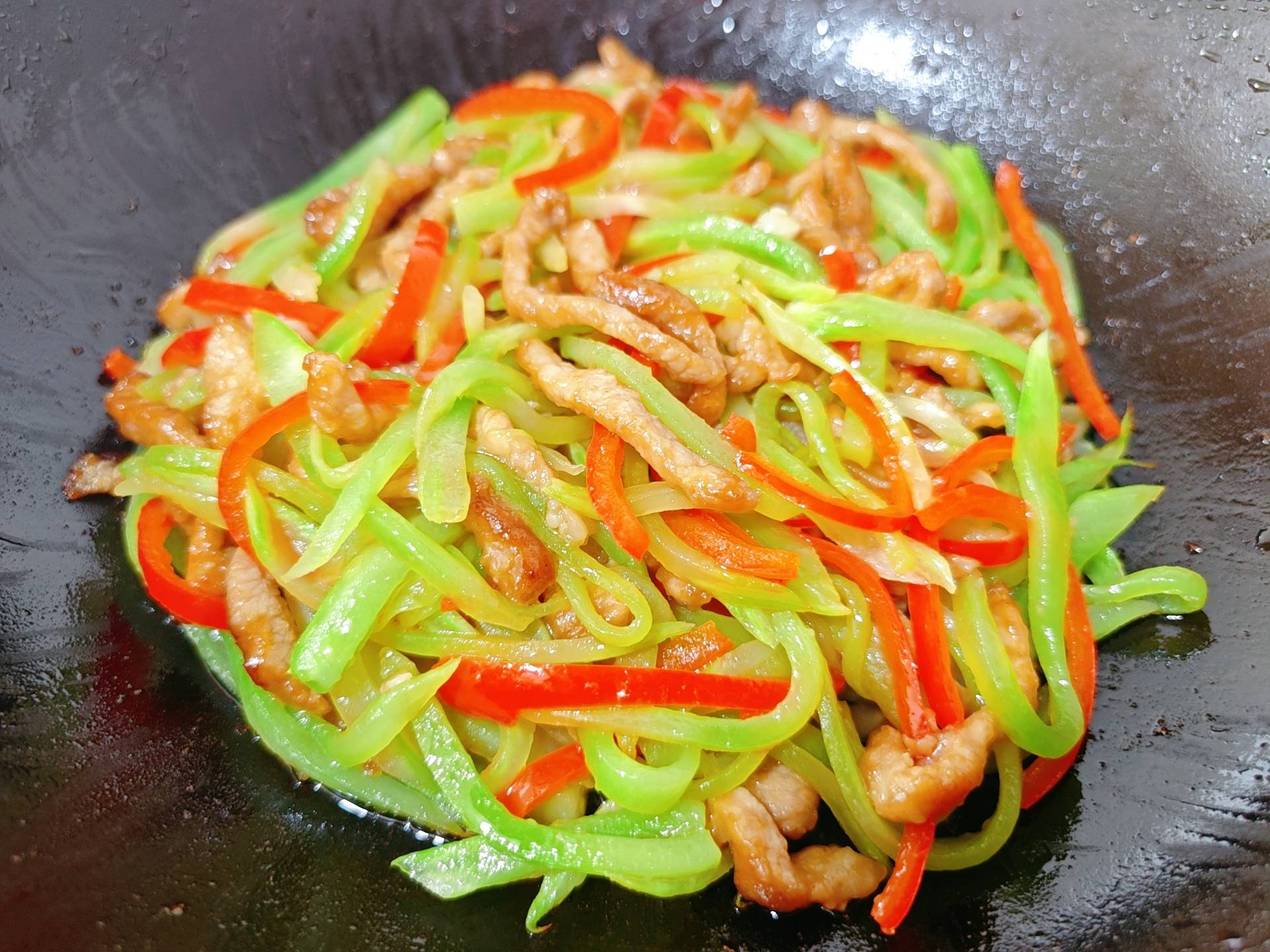 4、起锅烧油,先将肉丝倒在里边,加热以后去翻动,将其炒到根根变色。
