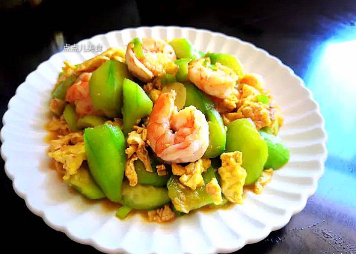步骤5将之前处理好的丝瓜挤干水分,倒入锅中与虾仁一同翻炒。再倒入炒好的鸡蛋,依次加入少许盐、生抽,继续翻炒均匀。整个翻炒过程大约持续一分钟即可。