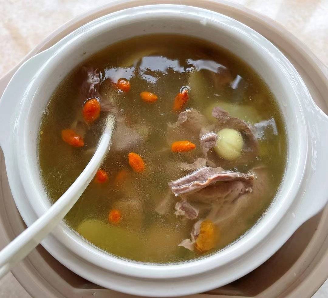 4、重新起锅,其中放猪心,莲子也倒里边,补足水,炖一个半钟头,全部的食材炖透,撒枸杞,一点点盐,就完成了。
