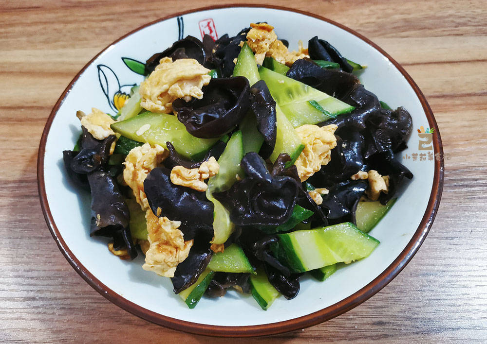 4、底油可以补一点,放点蒜蓉,木耳放进去,加点热水,接着炒一会儿,令其熟透,接着放酱油,醋,糖,盐,把味道调匀,再将鸡蛋,黄瓜放进去,炒到入味时,马上盛出。