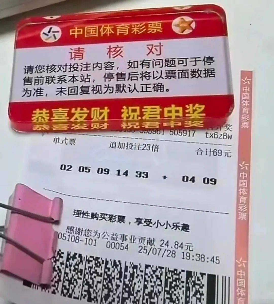 据购票清单,一名淄博彩民28日19时38分购买了单式票:02 05 09 14 33 04 09,并追加投注23倍,共花费69元,幸运开出一等奖。