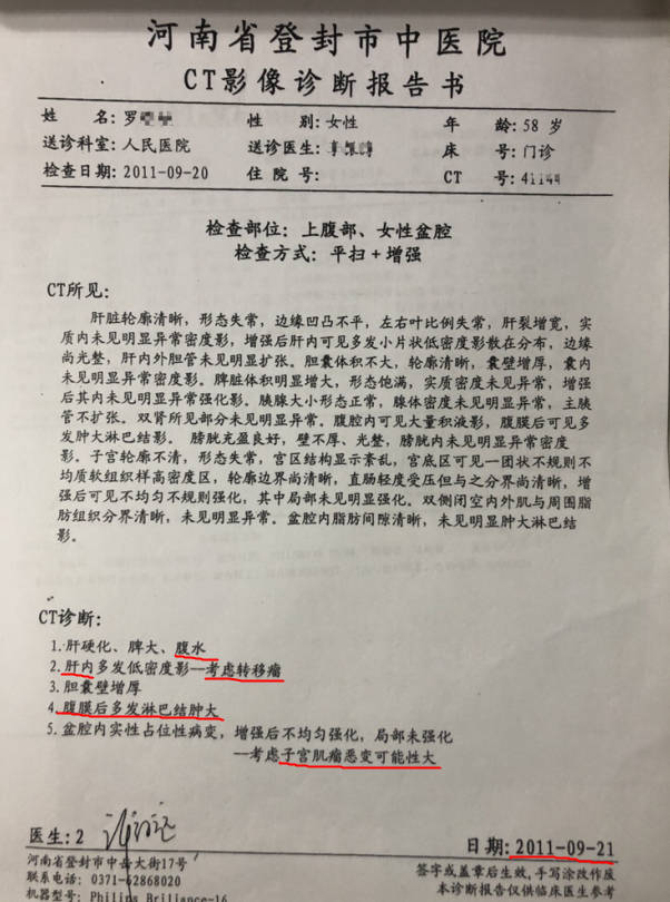 罗阿姨是在2011年9月,因为腹胀厉害,治不好,还出现肝腹水,到登封市人民医院检查的,结果被诊为“子宫肌瘤恶变,肝转移,腹膜后多发淋巴结肿大,伴肝硬化”。