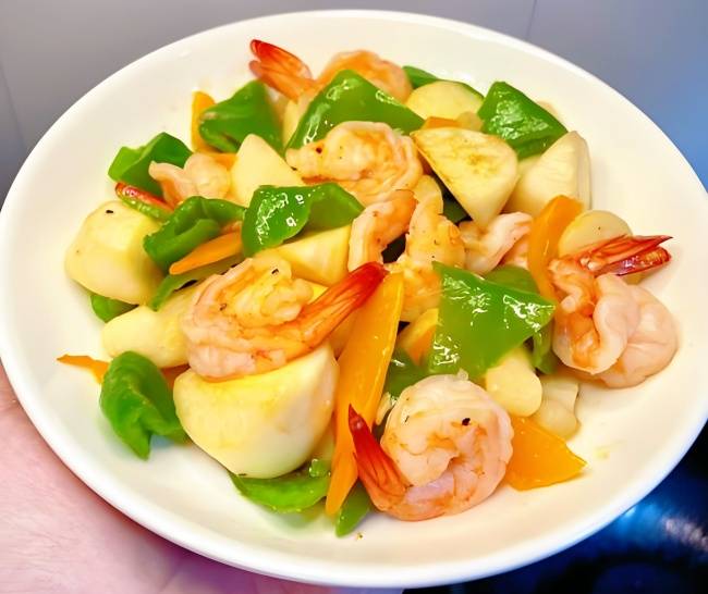 余油炒茭白丁1分钟,加入虾仁混合,加少量盐调味即可。