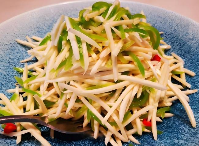 加入茭白丝和青椒丝,大火快炒至变软(约3分钟)。
