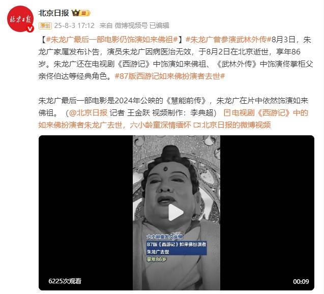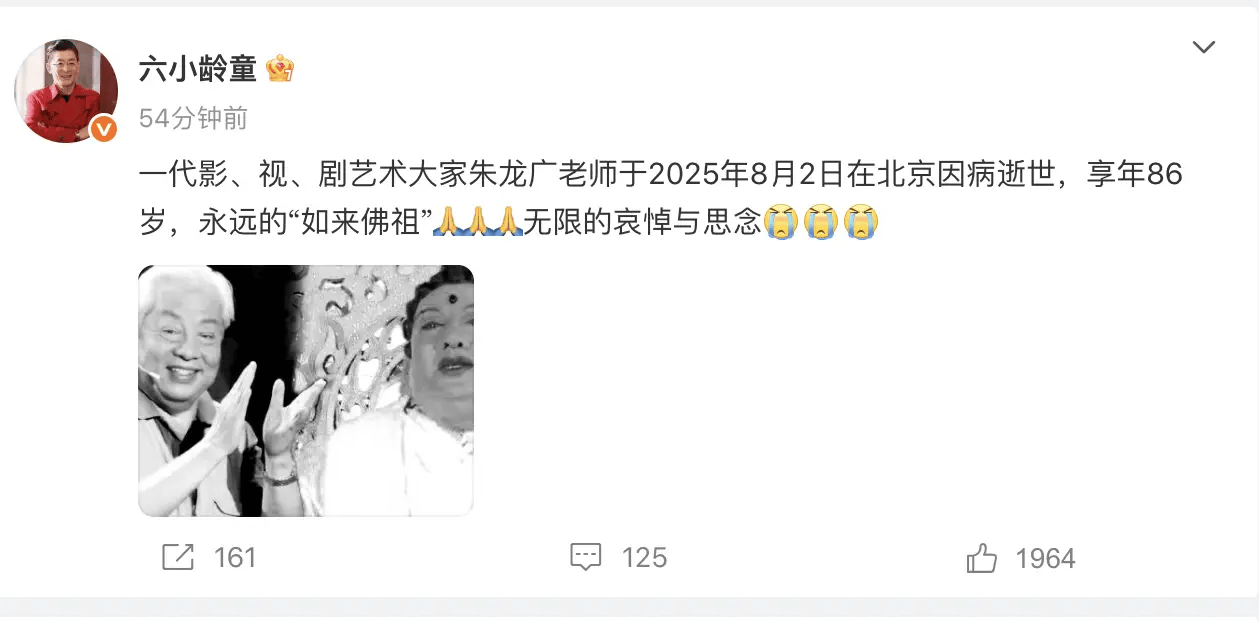 3日,六小龄童发文悼念朱龙广:“一代影、视、剧艺术大家朱龙广老师于2025年8月2日在北京因病逝世,享年86岁,永远的“如来佛祖”,无限的哀悼与思念。”