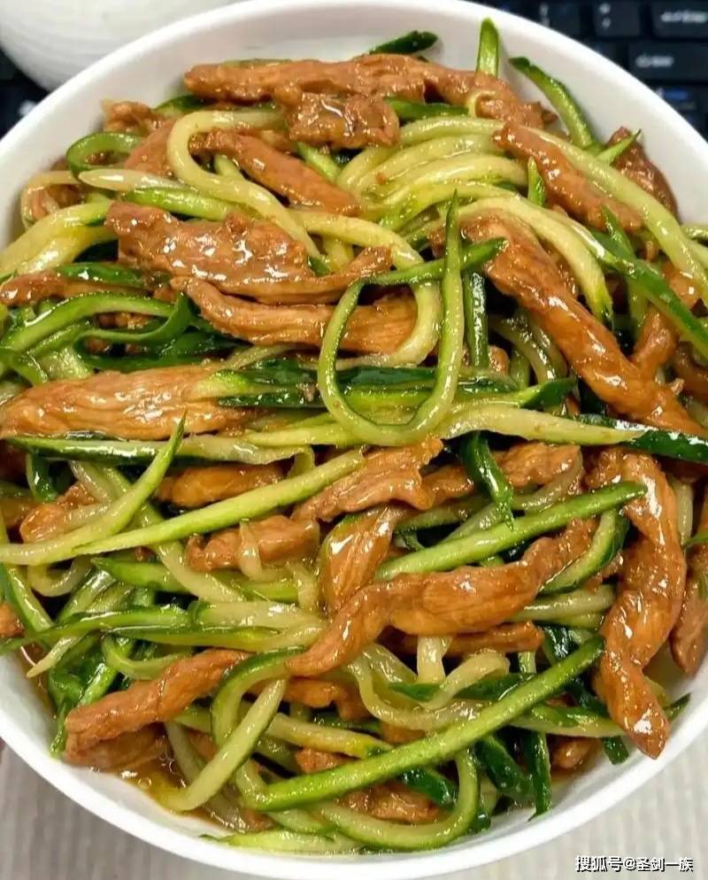 3.黄瓜切细丝倒入,加盐、鸡精、白糖