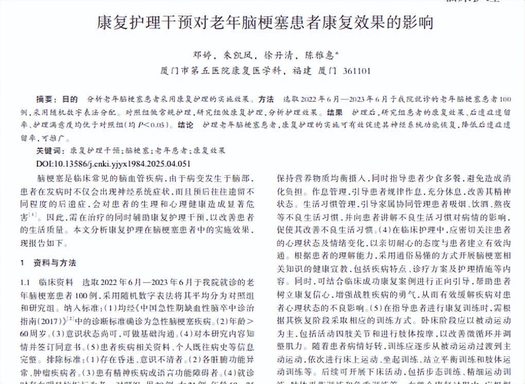 康复护理干预对老年脑梗塞患者康复效果的影 邓婷;朱凯凤;徐丹响清:陈雅惠中国冶金工业医学杂2025-07-31