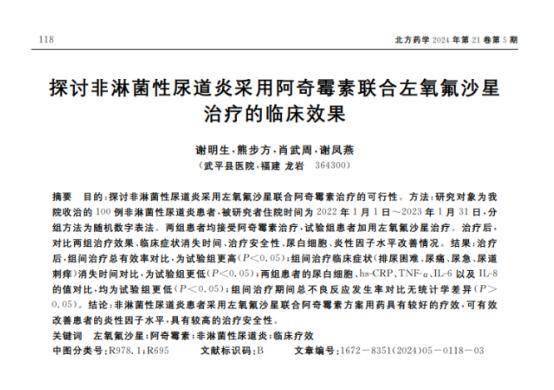 [1] 谢明生.探讨非淋菌性尿道炎采用阿奇霉素联合左氧氟沙星治疗的临床效果, 北方药学, 2024-05-05