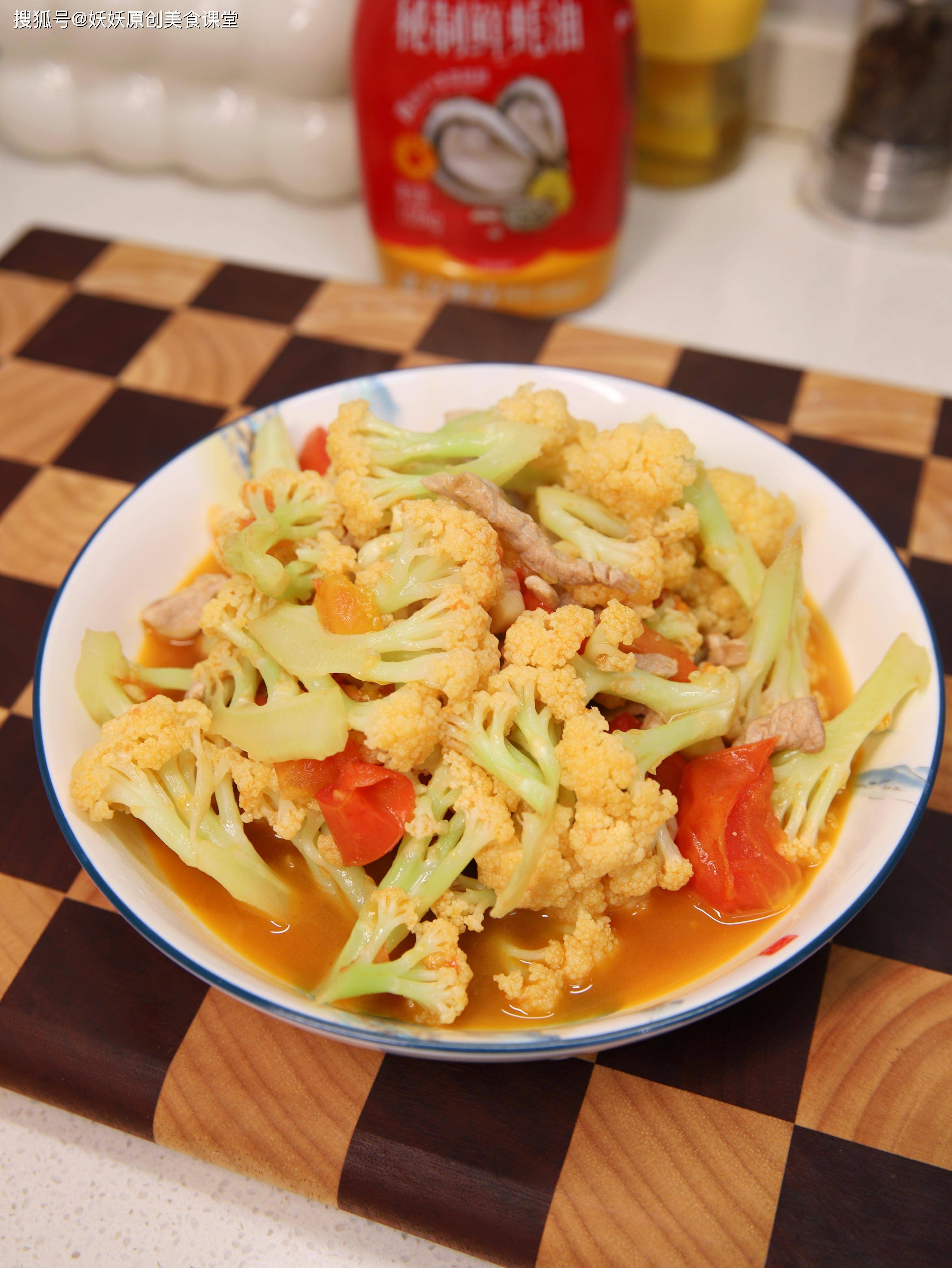 用料:有机花菜半个,西红柿一个,里脊肉一块,大蒜三瓣,蚝油一勺,盐少许,清水适量。