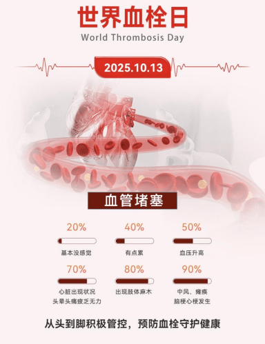 2025年10月13日是第12个“世界血栓日”。今年主题是“从头到脚,掌握主动:预防血栓,守护健康”。提醒我们:血栓可发生在身体任何部位,唯有主动预防,方能守护生命。