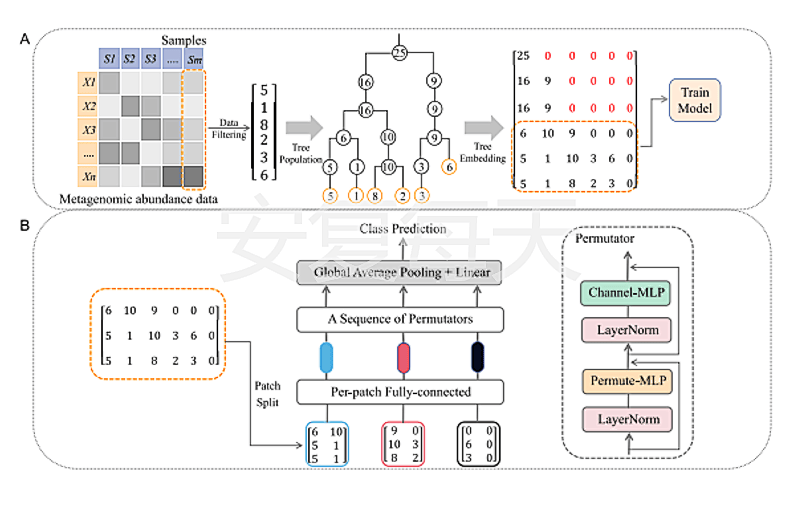 文章提到MetaP受到了Permutable MLP-like架构在视觉识别领域成功应用的启发,将这种先进的网络结构应用于宏基因组数据分析。通过利用系统发育树结构,MetaP能够将宏基因组丰度数据转换为二维矩阵,进而捕捉到微生物之间的系统发育信息。这个创新性的方法不仅显著提升了分类性能,还在多分类任务和大样本量的情况下展现出更高的准确率。