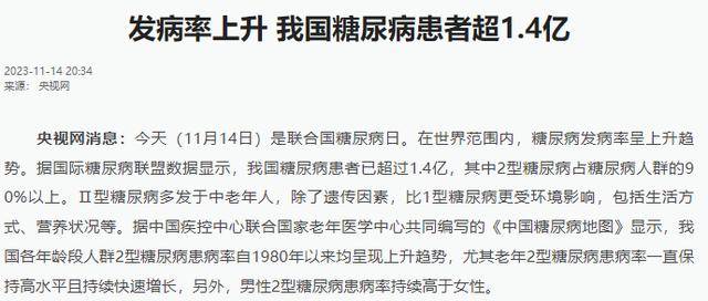 糖尿病患者总数已经达到1.4亿,位居世界第一。