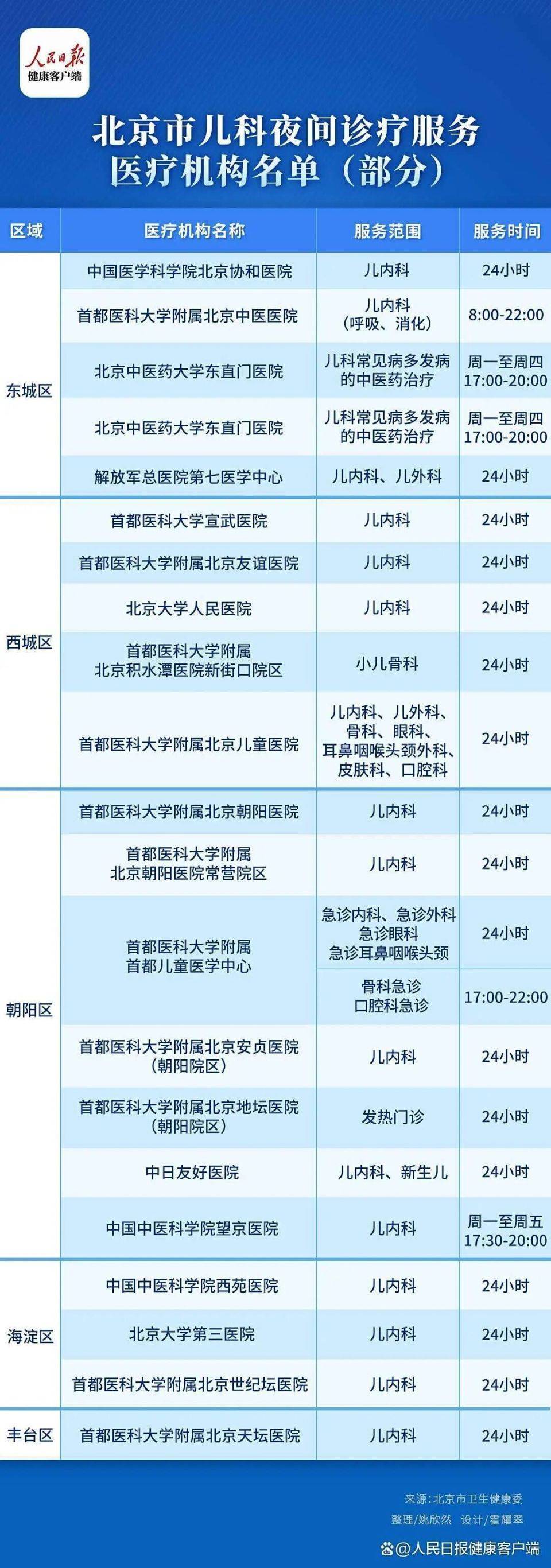 10月11日,北京市卫生健康委发布消息,北京市可提供儿科夜间诊疗服务的医疗机构(含分院区)共计88家,医疗机构会依据诊疗实际状况对儿科门急诊服务的范围和时间进行动态调整,以满足就医需求。