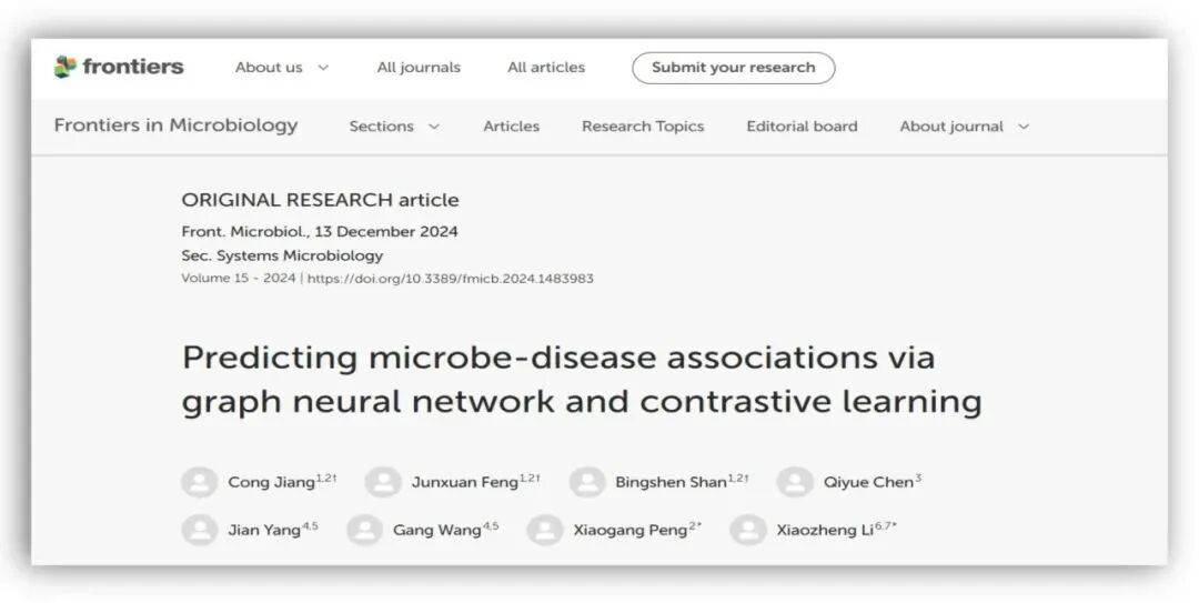 安复每天公司创始人李晓政博士联合坪山中心在知名期刊《Frontiers in Microbiology》发表了“Predicting microbe-disease association via graph neural network and contrastive learning”文章