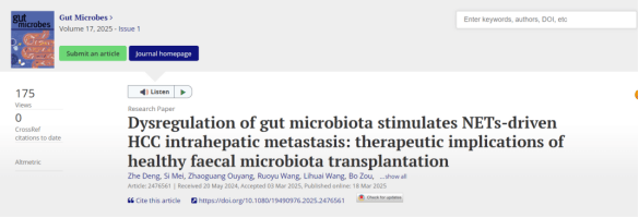 这一发现不仅破解了肝癌转移的核心机制,更催生出全新的“菌群抗癌疗法”,其临床转化速度远超预期,或将成为改写肝癌治疗史的里程碑,目前该研究已登上国际顶刊《Gut Microbes》首页。