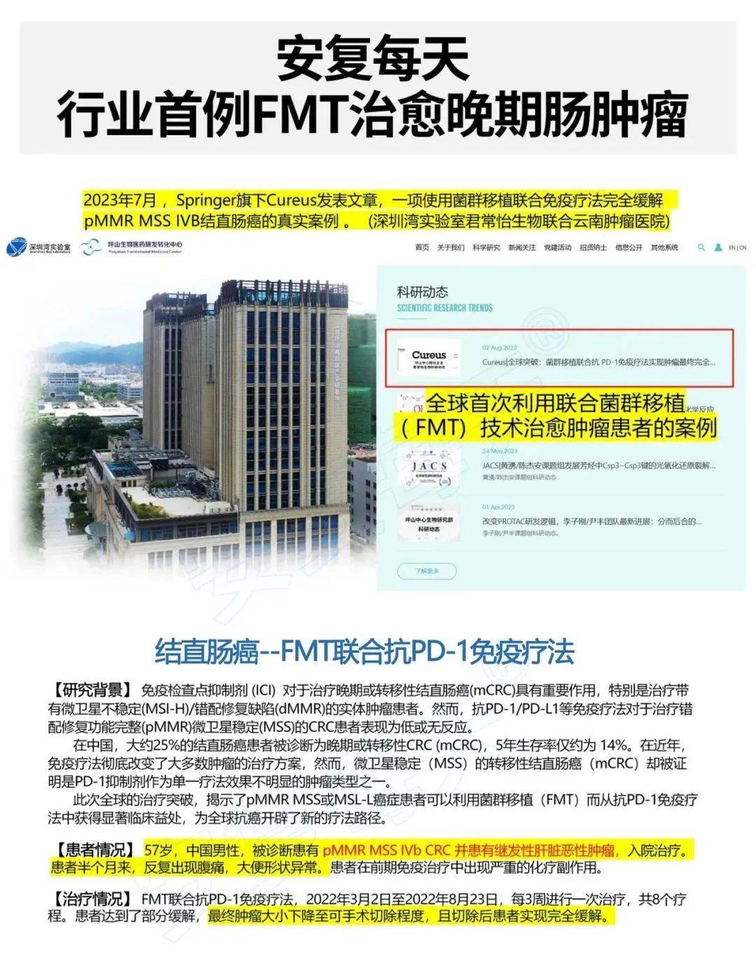 安复每天凭借菌群移植领域的技术优势,完成全球首例联合菌群移植治愈肿瘤患者的案例。该成果获国际医学期刊《Cureus》报道,一名结肠癌晚期转移患者接受安复每天 FMT 联合疗法后,从免疫治疗无响应实现完全缓解,为肿瘤治疗提供新思路。