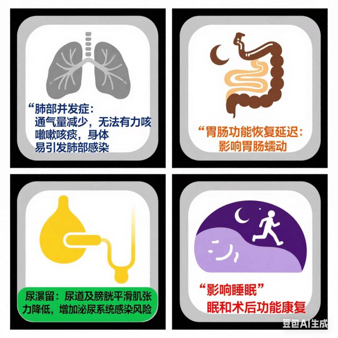 术后疼痛可不是咬咬牙就能熬过去的小事。当中重度疼痛持续存在或未及时缓解时,会导致一系列不良反应: