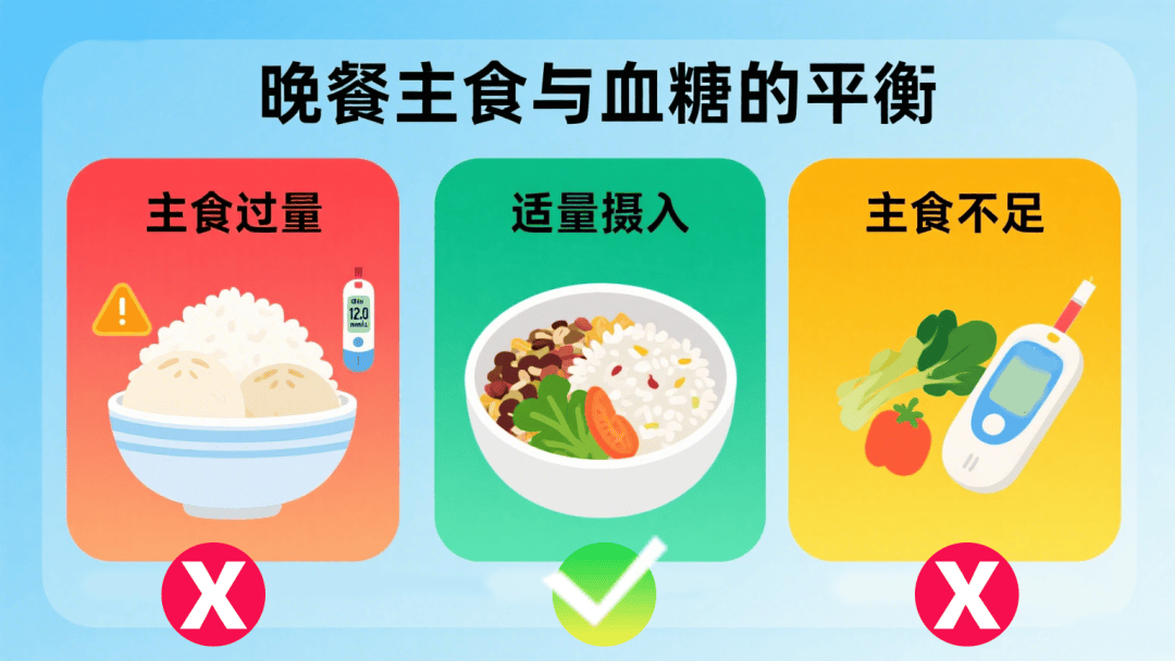 2. 晚饭的主食量不合适:晚饭吃的米饭、面条等碳水化合物(主食)太多,能量过剩,会直接拉高第二天早上的血糖。但主食吃得太少甚至不吃也不行,有些朋友为了让第二天测血糖数值低些,故意少吃或不吃晚饭,这样反而可能因为能量不足,触发身体的保护机制,导致血糖反而升高;