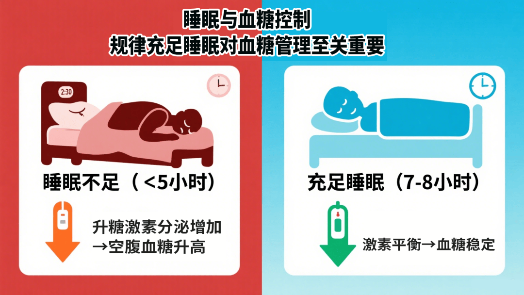 5. 睡眠不足或熬夜:前一天晚上没睡好、睡眠时间太短(特别是少于5小时),会打乱身体的正常节奏,让神经系统更兴奋,促使升糖激素(如肾上腺素、皮质醇)分泌增多,从而推高空腹血糖。保证充足、规律的睡眠对控制血糖很关键;