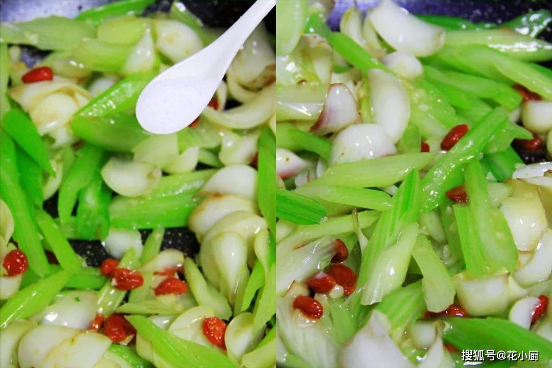 4、先把锅烧热,再倒上油。等油热了,把蒜末放进去,用铲子快速翻炒几下,把蒜末炒出香味。接着把西芹倒进锅里快速翻炒 30 秒。炒完西芹,再把百合和枸杞也倒进锅里,继续快速翻炒 30 秒。这百合和枸杞一加入,整个菜的颜色一下子就丰富起来了,看着就特别有食欲。