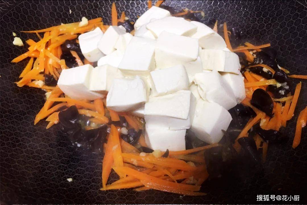 5、现在锅热了倒油,油热把蒜末放进去,慢慢炒等炒出香味来。蒜末炒香后,把胡萝卜丝和木耳丝倒进去翻炒个 1 分钟。接着把刚才焯好水的豆腐丁放进去,轻点翻别把豆腐弄烂了。把豆腐和其他食材翻均匀,让每一块豆腐都裹上香味。
