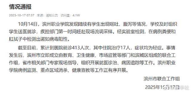 截至目前,累计到医院就诊413人次,其中住院治疗17人,症状均为轻症。事情发生后,滨州市立即成立由教育、卫生健康、市场监管等部门和滨城区组成的联合工作组,省市相关部门专家现场指导,组织开展就医诊治、病因追踪等工作。滨州职业学院病例监测、重点区域消杀、健康宣教等工作正有序开展。