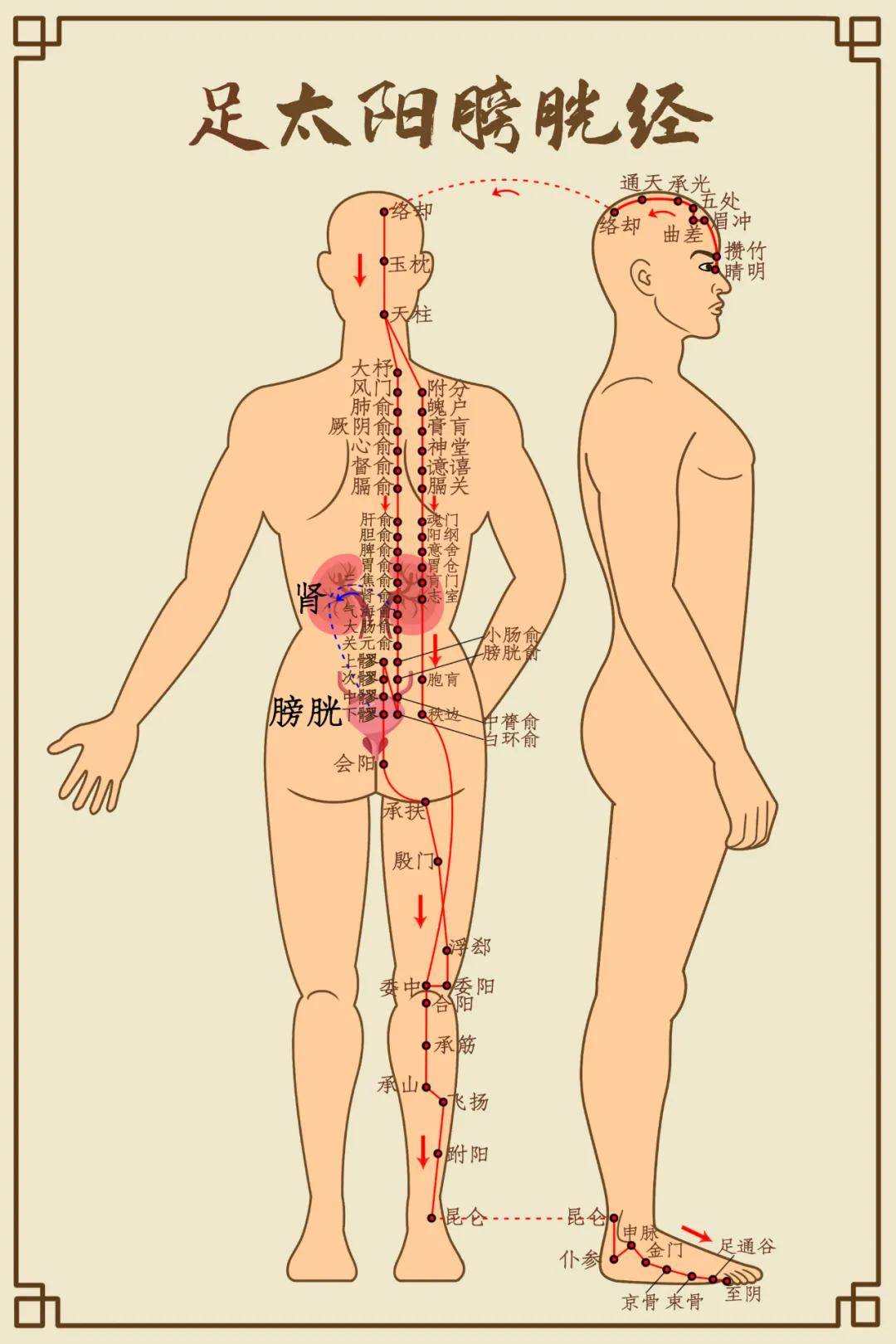 而膀胱经是掌握尿液和汗液这两条通道的,是当之无愧的“排毒司令”,所以膀胱经一定不能被堵住!