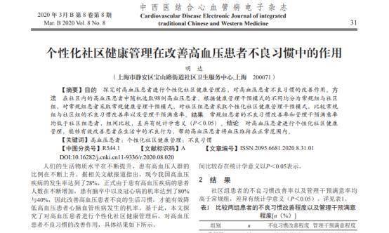 [1]明达.个性化社区健康管理在改善高血压患者不良习惯中的作用[J].中西医结合心血管病电子杂志,2020
