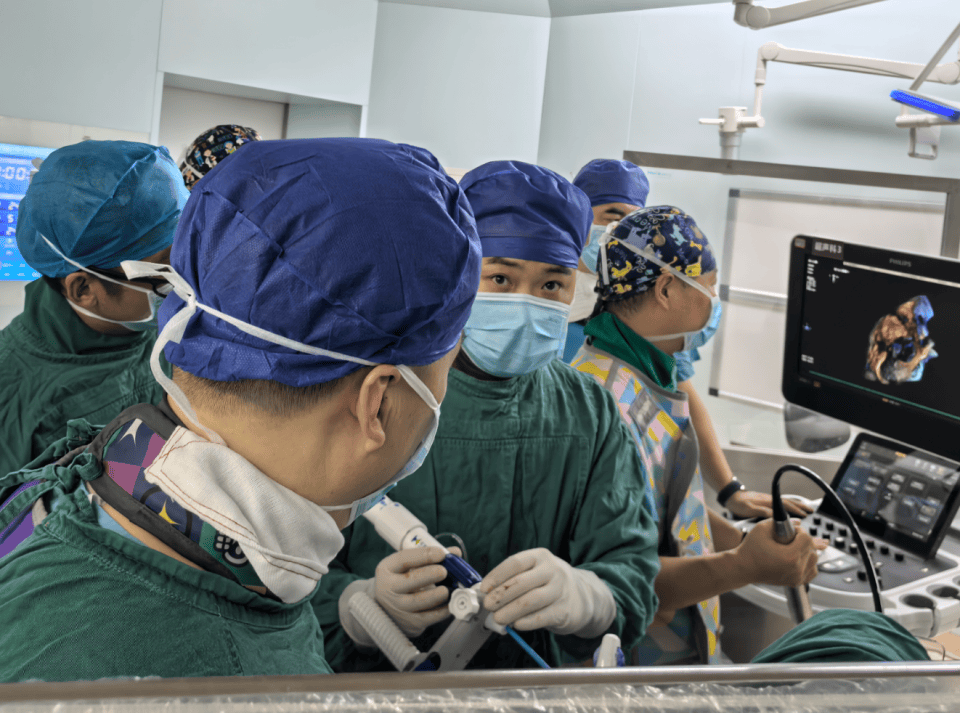 手术当天,韩宇博士带领团队,联合心外科有远兵博士、麻醉科郎志斌副主任医师、超声科韩相国副主任医师和手术室护理团队,开始了毫米级的高难度操作。