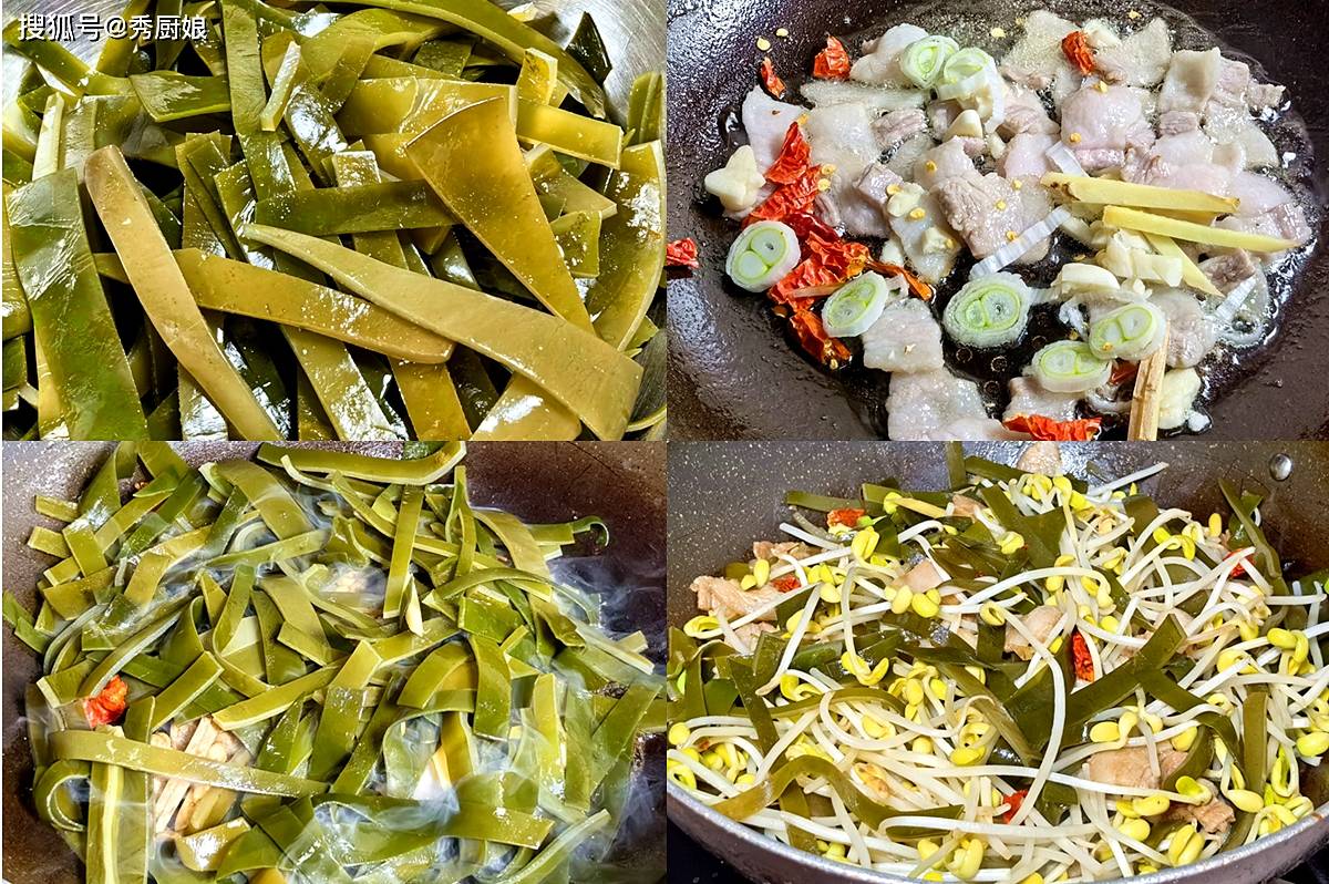 1. 干海带提前用温水泡发,洗净后切成小块;黄豆芽洗净沥干;五花肉切成薄片,准备点蒜末和葱花。