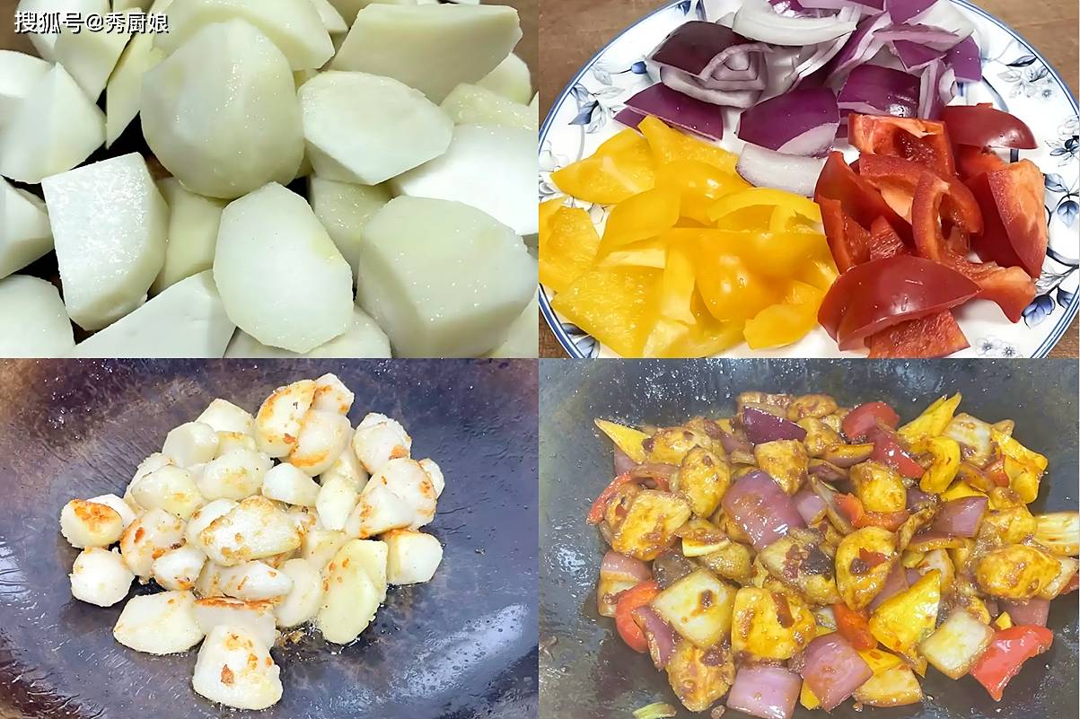 1. 芋头去皮切小块(记得戴手套,防止手痒),上锅蒸8分钟左右至半熟;洋葱、红椒分别切块。