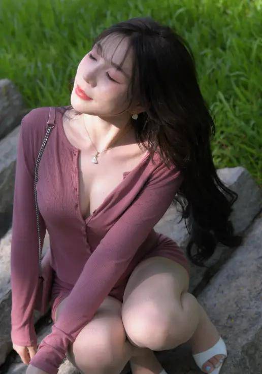 修身的背心勾勒出健康的线条,短裤则展现出活力与自信。这一身站在那里,本身就是一道风景。阳光透过树叶洒下来,酒红色的面料泛着柔和的光泽,与背后绿色的草坪、葱郁的树木形成了极其强烈的视觉对比。说句实在话,在摄影里,这就是最出片的“油画感”画面,她想不成为焦点都难!