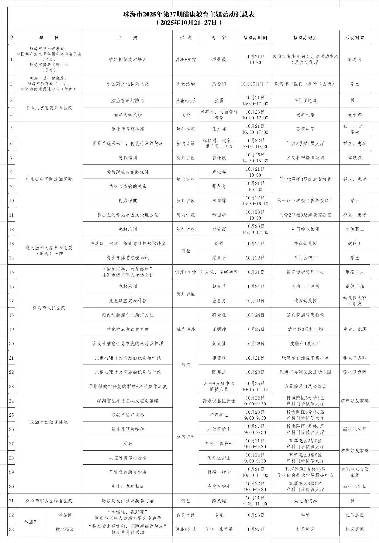 为提高居民健康素养,促进全民健康,珠海市健康促进中心牵头统筹各区、各医疗卫生健康单位,常态化开展健康主题活动。10月21-27日,计划开展33场健康主题活动,通过科普健康科学知识,倡导广大市民养成健康生活方式,做好自己和家庭健康第一责任人。