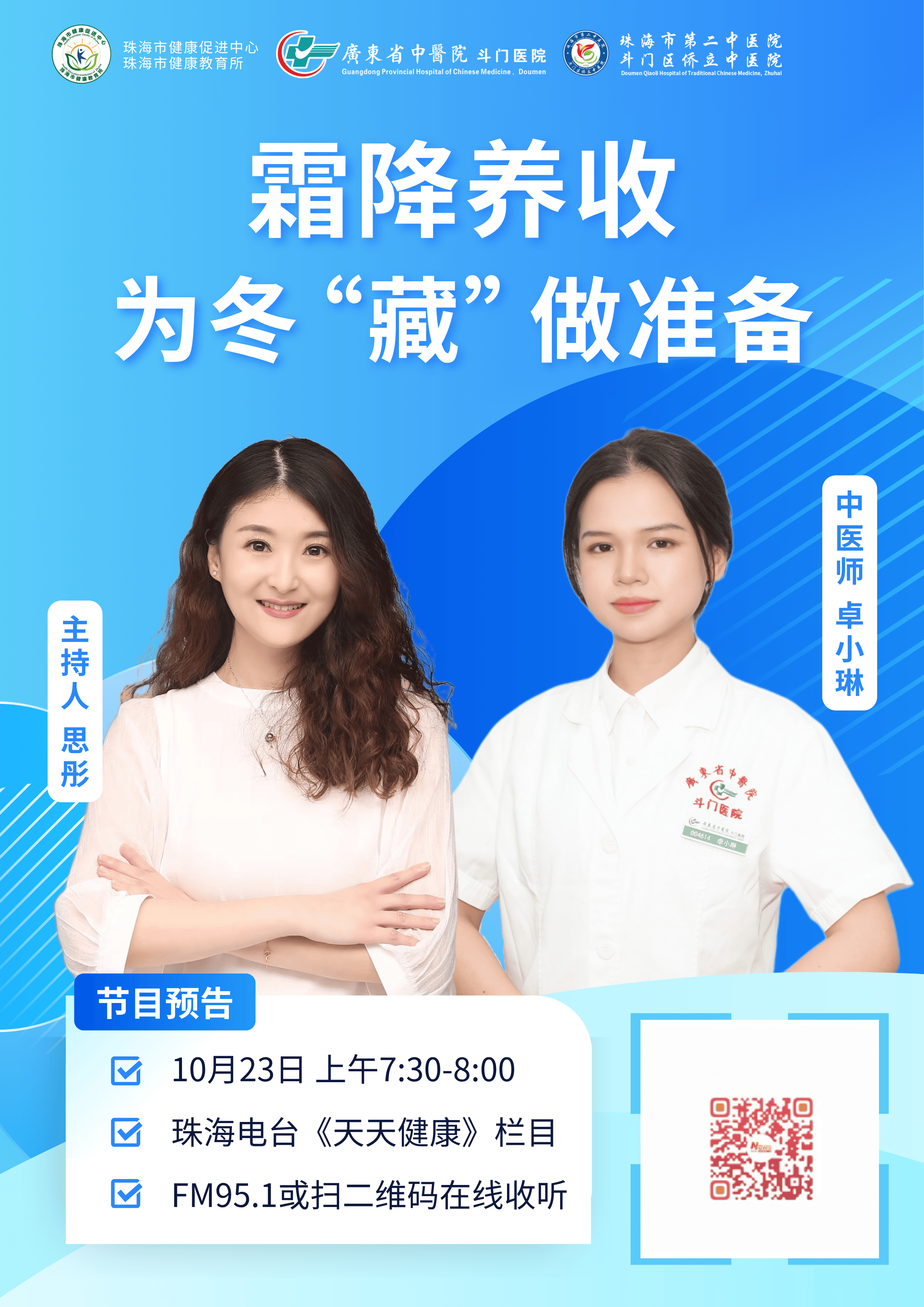 想知道更多具体的时令养生方法,记得锁定10月23日7:30-8:00的珠海电台FM95.1《天天健康》节目,听卓医生详细讲解~