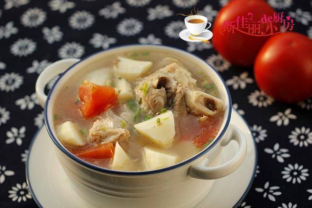 制作过程: 烧锅水,将棒骨块冷水下锅焯煮, 加入姜片去腥,焯出浮沫后捞出放入电炖锅中, 再加入适量的水(注意煲汤时水要一次性加足),加入几片姜, 按下电炖锅上煲骨头汤的功能键, 待到还剩下20分钟左右时,加入准备好的铁棍山药段和番茄继续炖煮,最后炖煮好后加入少许盐和胡椒粉调味,盛入钵中,撒上葱花既可。