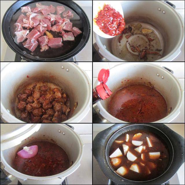 制作过程: 提前将芋头去皮后切成滚刀块; 牛腩切成麻将大小的块备用;烧锅水,将牛腩块冷水下锅焯水,加入姜片去腥; 烧热压力锅放入少许油,加入郫县豆瓣酱和香叶等大料简单翻炒两下, 再加入焯好的牛腩块翻炒几下,再加入少许料酒和酱油翻炒均匀, 加入适量的水; 下入半个洋葱(洋葱是为了帮助去腥,煮好后整个捞出不用), 加盖后用压力锅炖煮牛肉直至软烂。 将炖煮好的牛腩汤盛入小锅中加热,加入准备好的芋头块,将其煮至软烂后加入少许盐和胡椒粉调味,大火收汁后盛入钵中,撒上少许葱花既可。