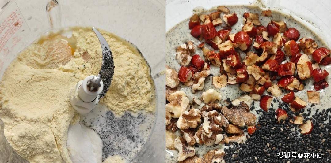 食材:180 克牛奶或者水、60 克无糖豆浆粉、30 克黑芝麻粉、5 克泡打粉、10 克代糖、再加上 2 枚鸡蛋。另外,红枣碎、黑芝麻、核桃碎适量就行,这些可以根据自己的喜好来放。