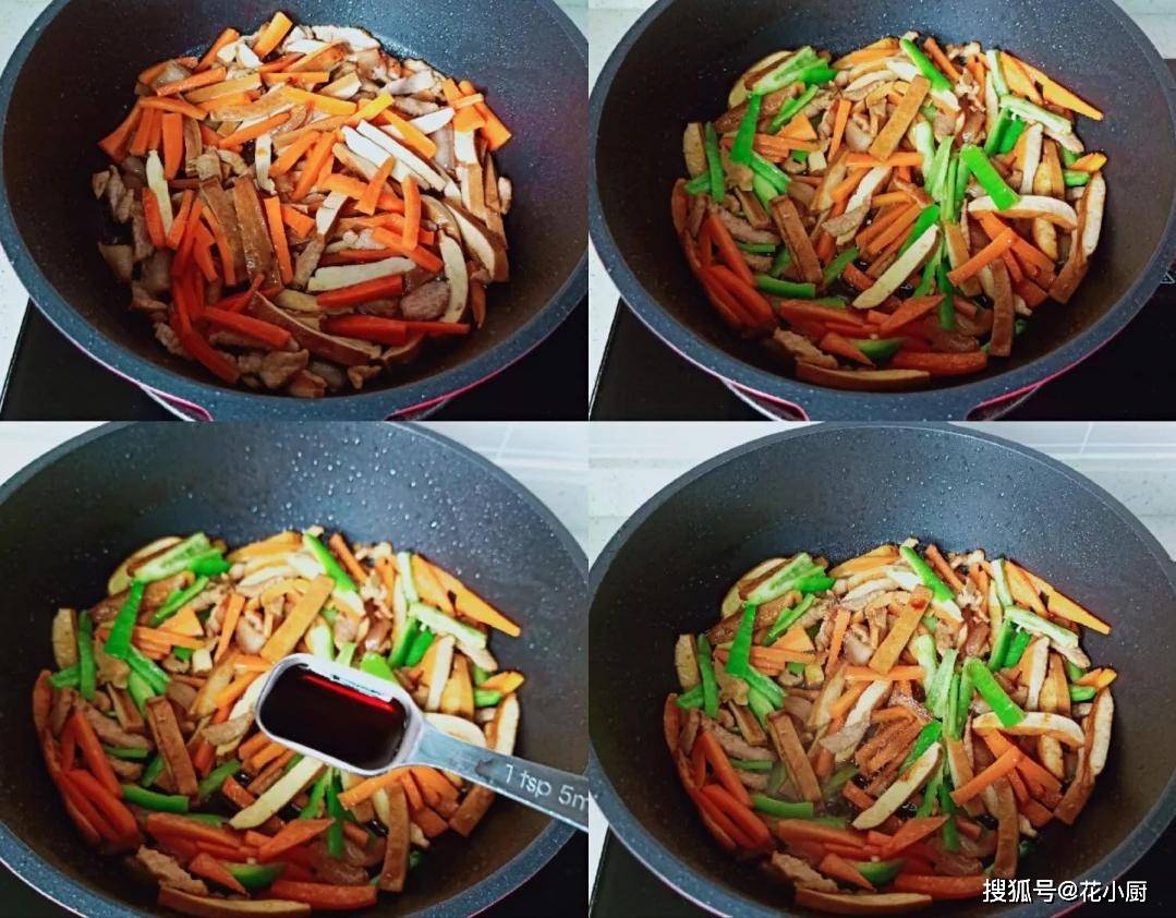 4、咱把豆干丝放进锅里,翻炒一分钟,让豆干丝也吸收吸收肉丝的香味。一分钟过后,再把胡萝卜丝和青椒丝放进锅里,调味往锅里加入两勺生抽和半勺盐,然后用铲子快速地翻炒均匀。等所有食材都均匀地裹上了调料,这道菜就算大功告成啦!