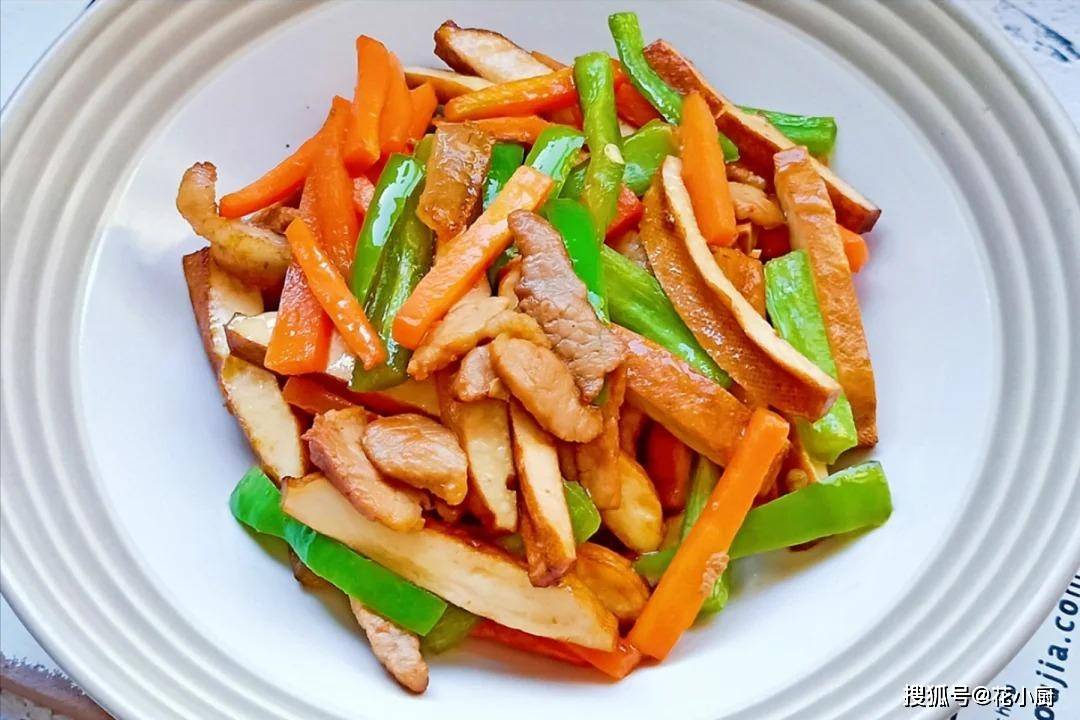 满满一盘的豆干炒肉,颜色鲜艳,香气扑鼻,我的口水都快流下来了。夹上一筷子放进嘴里,豆干的韧性、肉丝的鲜嫩、胡萝卜的清甜还有青椒的清爽,各种味道在嘴里融合在一起,那滋味,简直绝了!