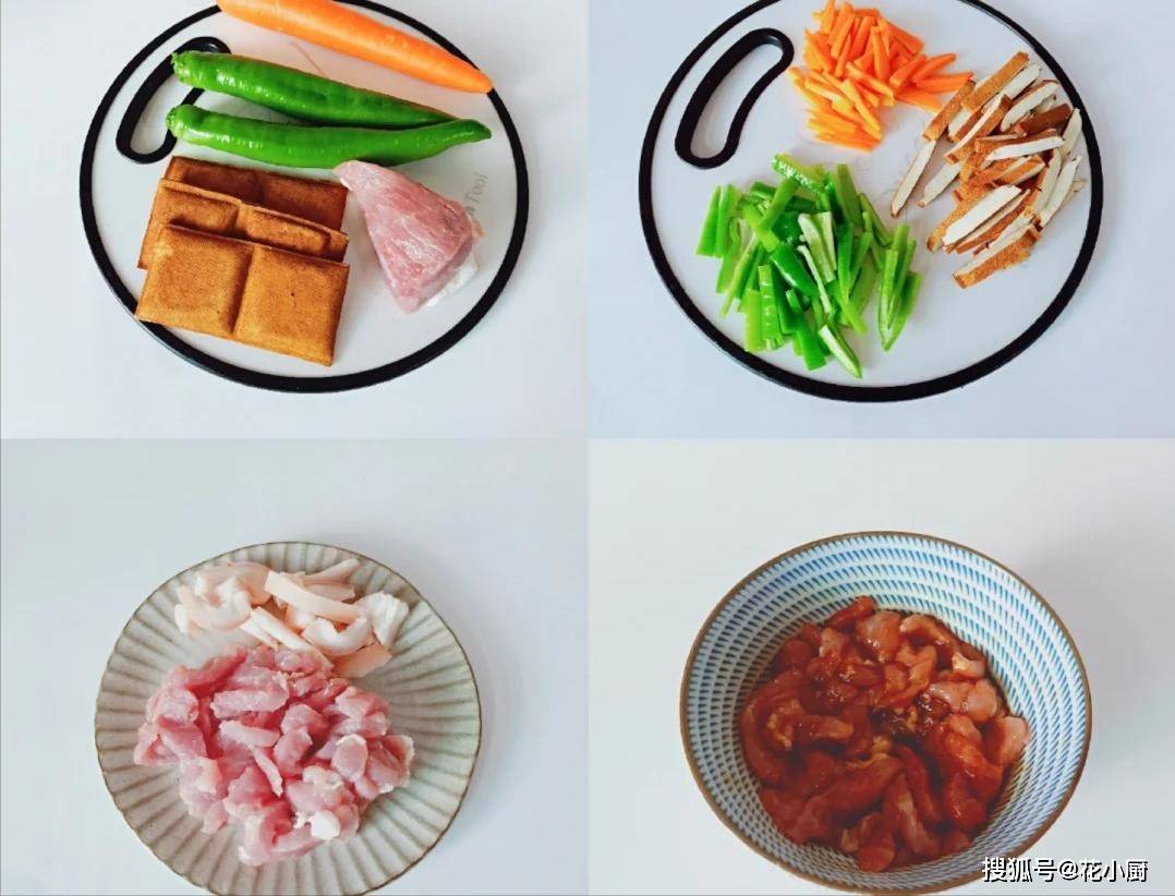 食材:一根胡萝卜、两个青椒、三块豆干、150 克猪肉、两勺生抽、一勺蚝油、一勺料酒、半勺盐