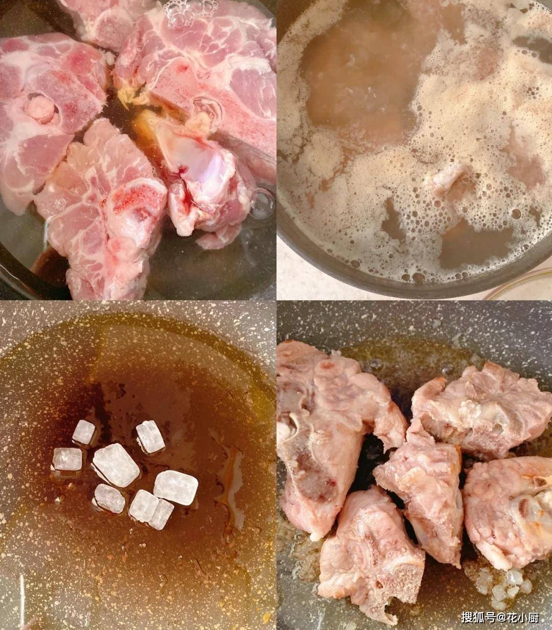 2、开始炒糖色啦。起锅倒上一些油,等油热了,把冰糖放进去,慢慢搅拌,等冰糖融化变成焦糖色,这糖色就炒好啦。把焯好水的排骨放进锅里,快速翻炒接着把花椒、八角、桂皮也放进锅里,和排骨一起翻炒;