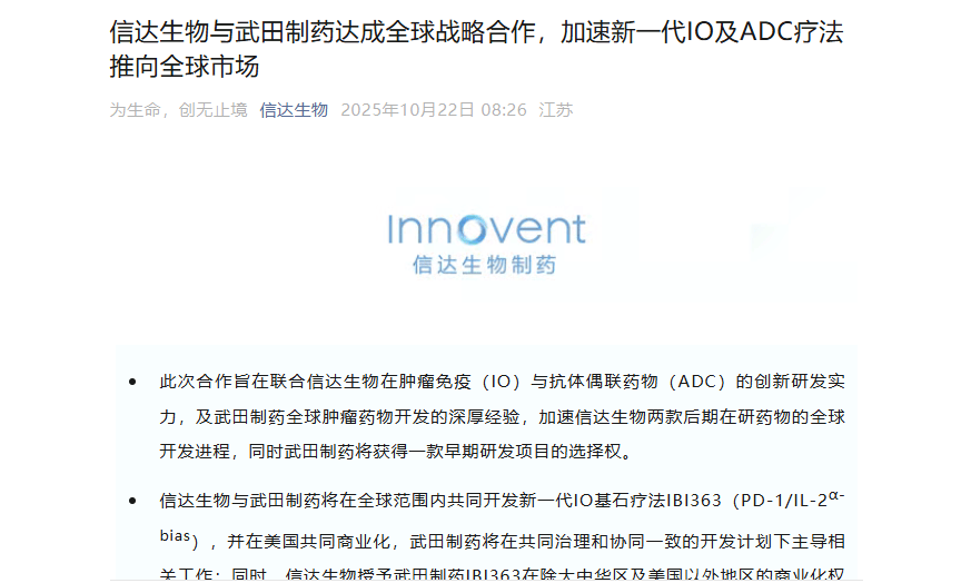 10月22日“信达生物”公众号发布,信达生物制药集团宣布与武田制药达成重磅全球战略合作,共同加速推进信达生物新一代IO与ADC疗法的全球开发,打造颠覆性癌症治疗方案,造福全球患者。