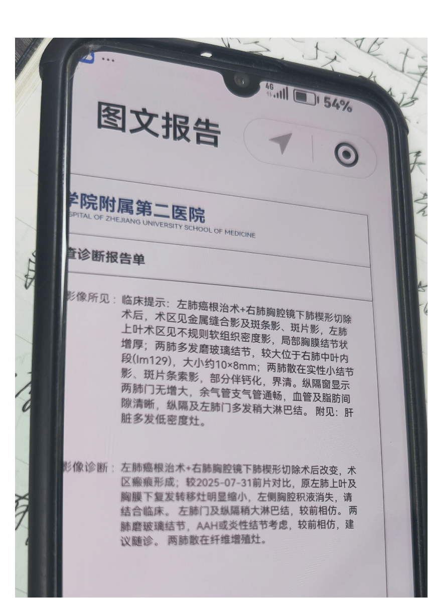 本以为手术能斩草除根,没想到术后不久,汪女士的肺部又出现了新发病灶。2024年底,她再次接受了手术治疗。然而,命运的考验并未结束。2025年4月,汪女士开始出现频繁干咳,复查结果如晴天霹雳:肺癌复发并伴随转移。医生紧急为她制定了靶向治疗方案,但服药后,乏力、口腔溃疡、皮疹、流鼻涕、咽部堵塞等一系列副反应接踵而至,让她痛苦不堪。