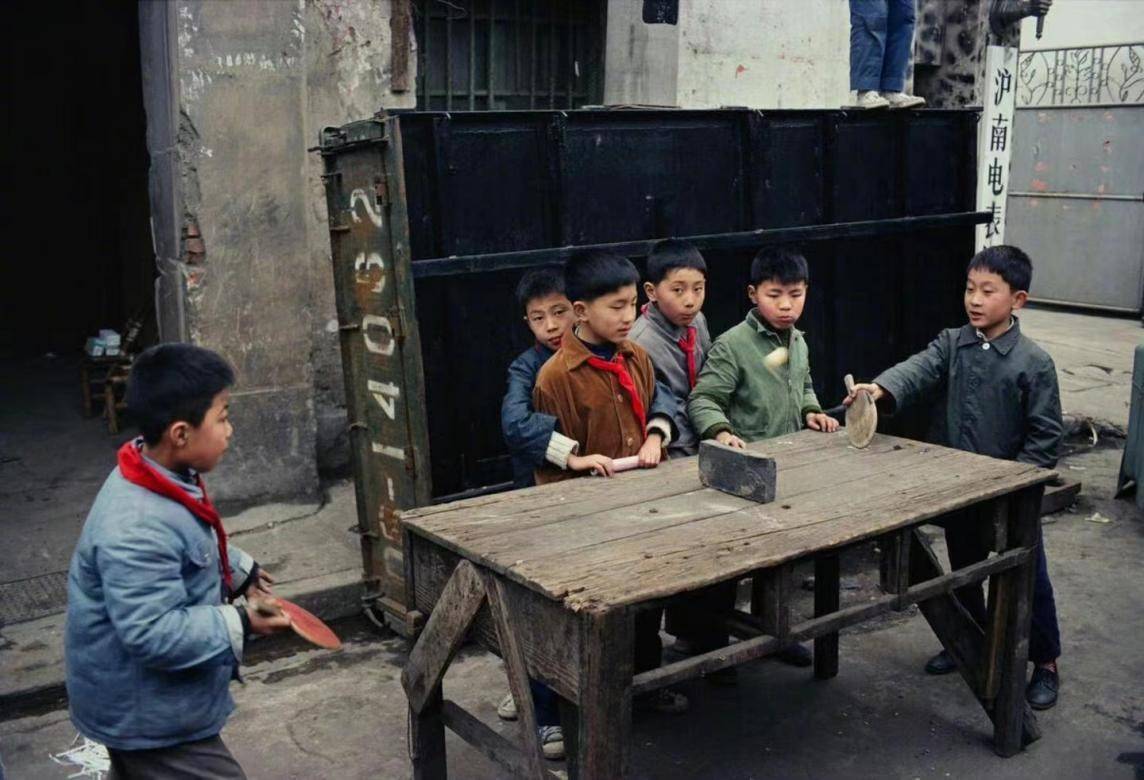 几位小朋友在沪南电表厂一起打乒乓球,球桌是用一块砖头支撑起来的。尽管条件简朴,但他们的笑容却是那么灿烂,仿佛那时的梦想也随着这些少年一同成长。大家的衣着简单朴素,没有过多的装饰,更多的是实用和简洁。