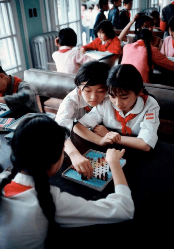 在课间,学生们围坐在一起玩跳棋。照片中的长发女孩扎着两个麻花辫,穿着洁白的衬衫,脸上带着活力的笑容,显得十分青春。尤其可以看出其中一个女孩是中队长,脸上充满了责任感和自信。